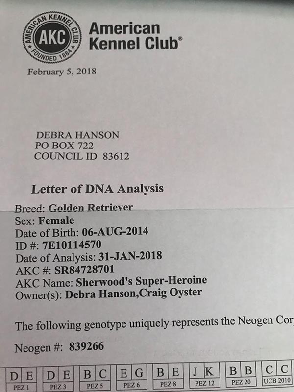 February 12, 2018 - After checking my post office box daily for the AKC results, two months later, it arrives - THE AKC DNA ON THE DOG I SWABBED AT THE INSPECTION IS..... DIVA!!